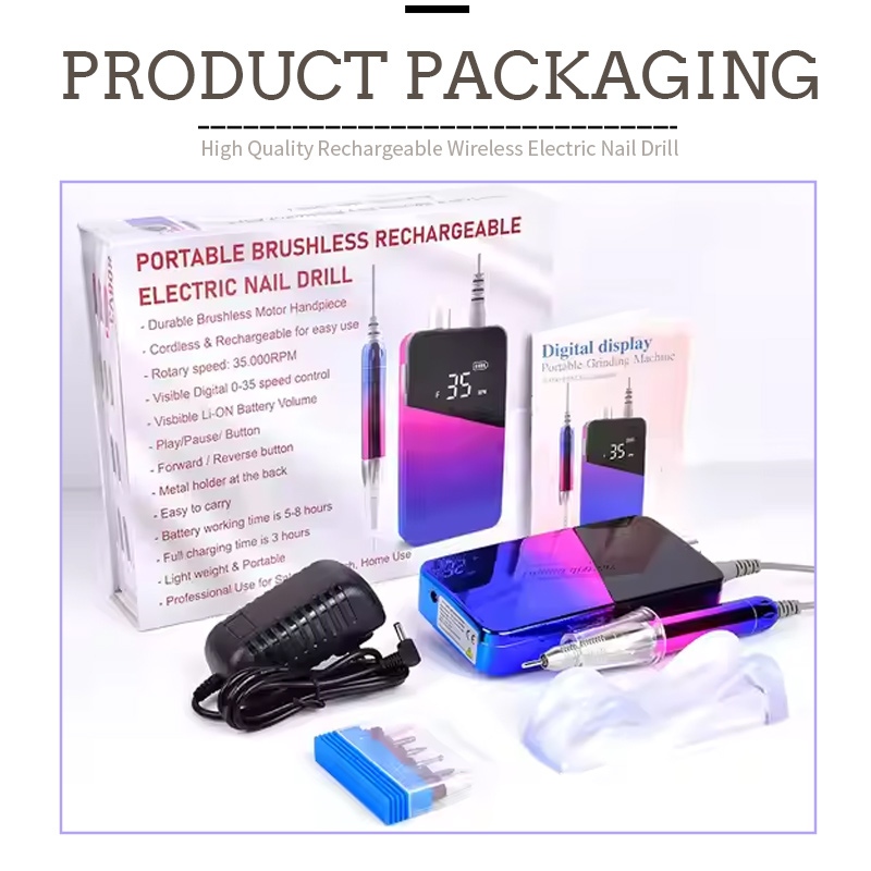 Съдържанието на този пакет с електрическа бормашина за нокти с 30 000 оборота в минута включва продукт за шлайфане, USB кабел за зареждане, ръководство за употреба на продукта и лека и преносима кутия.
