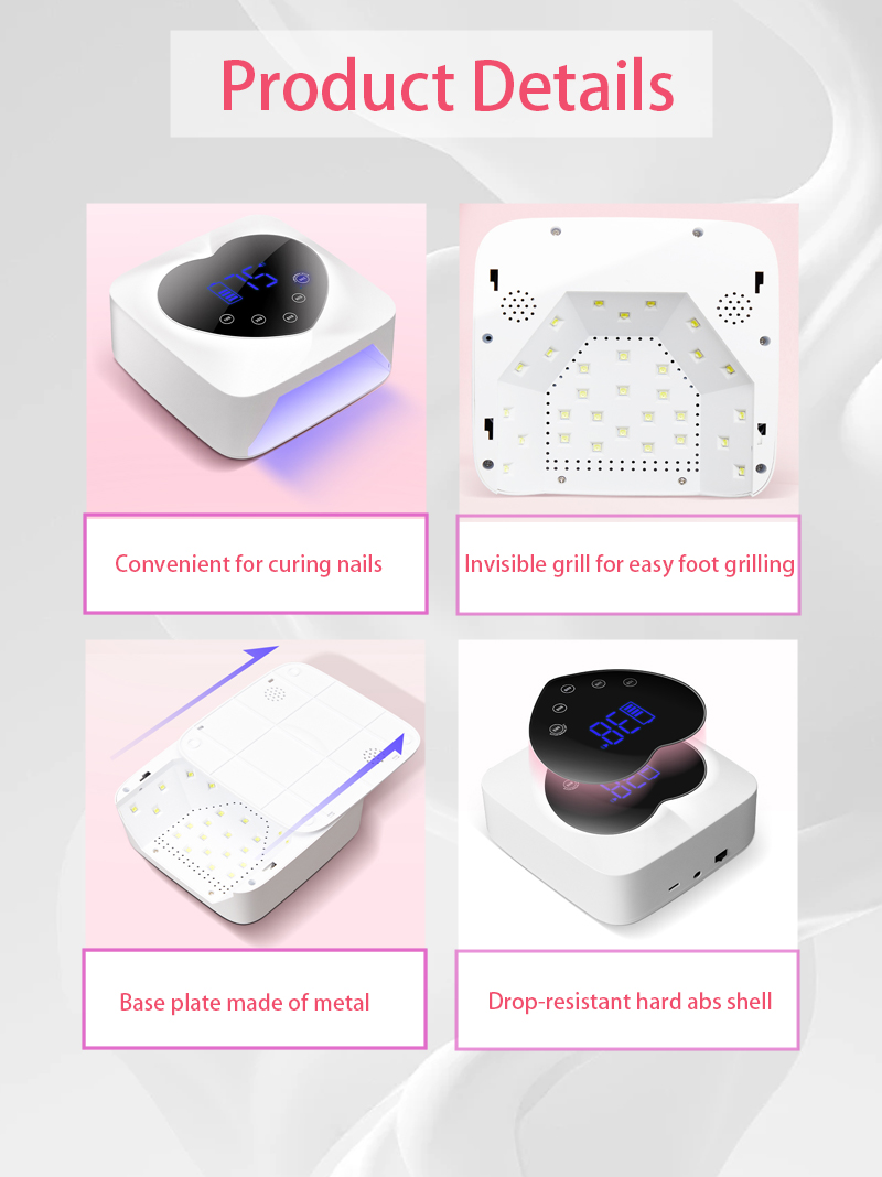 Продуктът осигурява равномерно изсъхване на лепилото без свиване. Неговите двойни източници на светлина осигуряват нежно нагряване, за да се предотврати обезцветяването на ръцете и напрежението на очите, подходящ както за ръце, така и за крака, осигурявайки забележително бързи резултати от изсушаване.