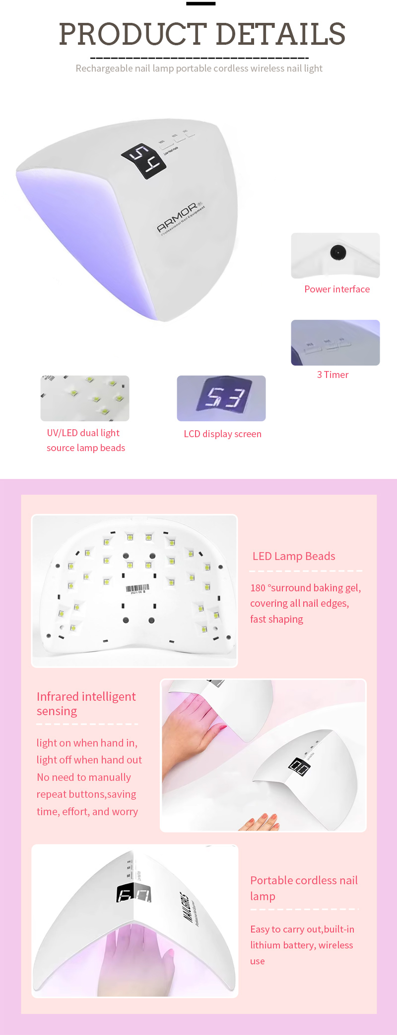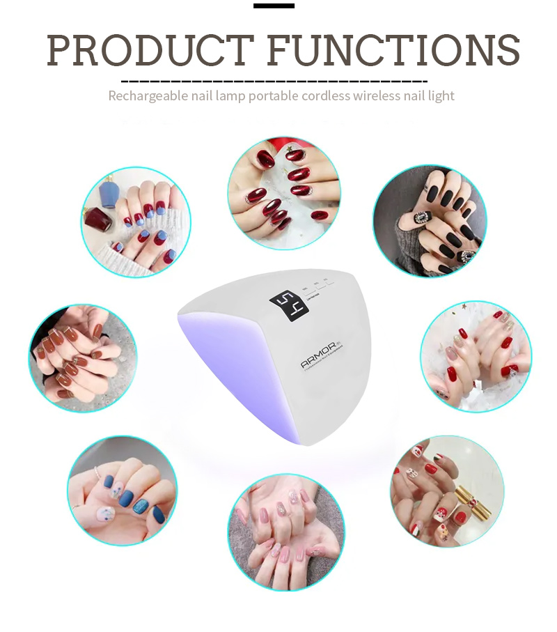 Продуктът гарантира дори сушене на лепило без свиване. Двойните му източници на светлина осигуряват нежно отопление, за да се предотврати обезцветяване на ръцете и напрежение на очите, подходящи за ръцете и краката, което осигурява забележително бързи резултати от изсушаване.