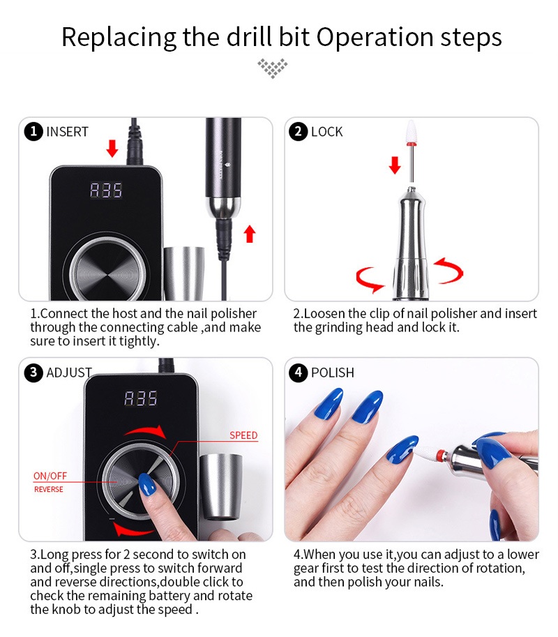 Дизайнът на дисплея на тази ексфолираща 35 000 оборота в минута електрическа бормашина за нокти има превключвател за включване/изключване и въртене напред/назад за общо активиране с един бутон, гнездо за бързо зареждане в долната част, сменяемо гнездо за бормашина в горната част и регулируема скорост в три позиции, за да отговори на различни нужди.