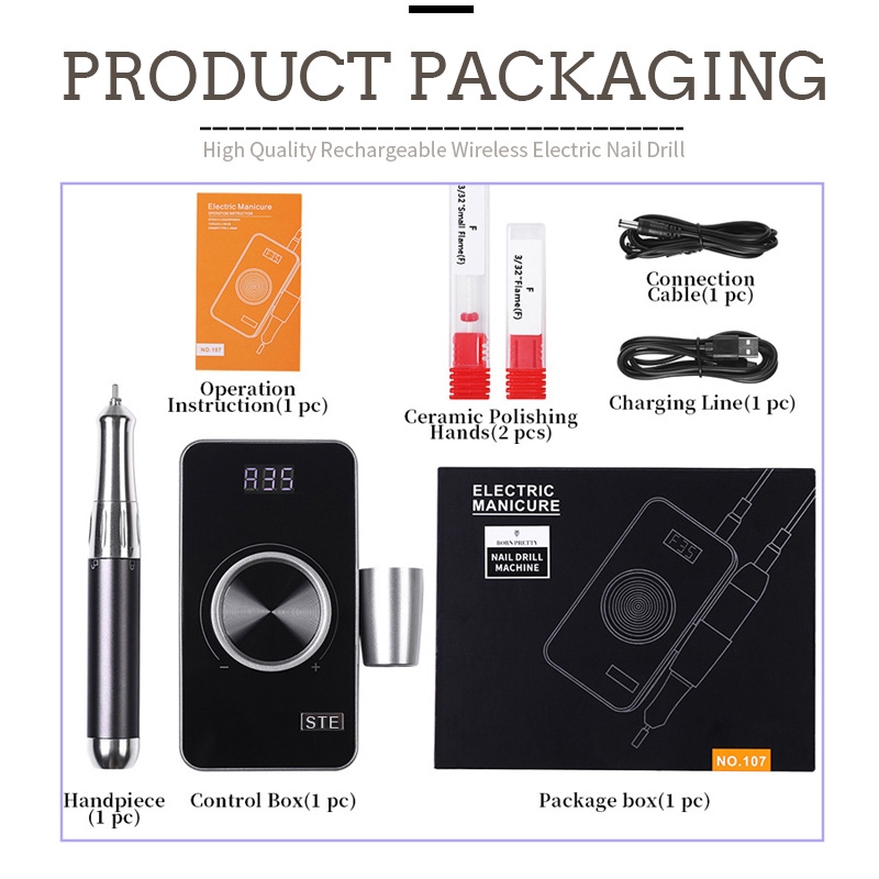 Съдържанието на този ексфолиращ пакет с електрическа бормашина за нокти с 35 000 оборота в минута включва продукт за шлайфане, USB кабел за зареждане, ръководство за употреба на продукта и лека и преносима кутия.