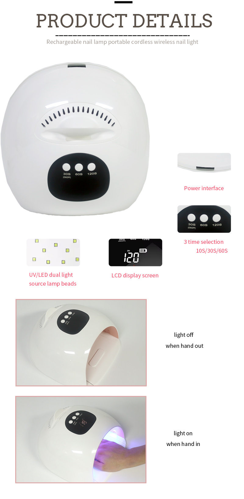 Продуктът осигурява равномерно изсъхване на лепилото без свиване. Неговите двойни източници на светлина осигуряват нежно нагряване, за да се предотврати обезцветяването на ръцете и напрежението на очите, подходящ както за ръце, така и за крака, осигурявайки забележително бързи резултати от изсушаване.