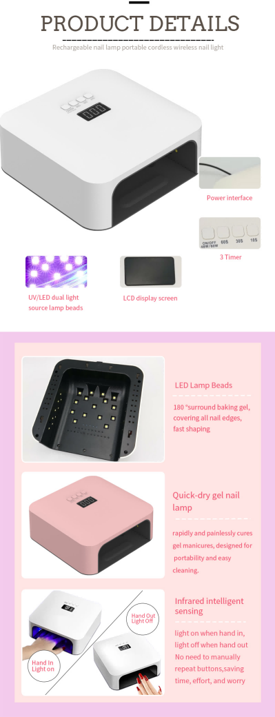 Висококачествена лампа за бързо изсъхване на ноктите осигурява равномерно изсъхване на лепилото без свиване. Неговите двойни източници на светлина осигуряват нежно нагряване, за да се предотврати обезцветяването на ръцете и напрежението на очите, подходящ както за ръце, така и за крака, осигурявайки забележително бързи резултати от изсушаване.