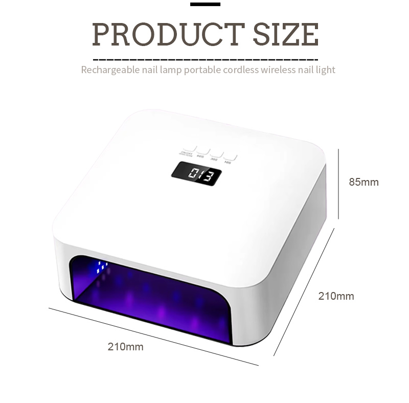 Размерите на тази висококачествена лампа за бързо изсушаване на нокти са 210 мм дължина, 210 мм ширина и 85 мм височина, с голям капацитет и възможност за използване както на ръцете, така и на краката, което е много удобно.