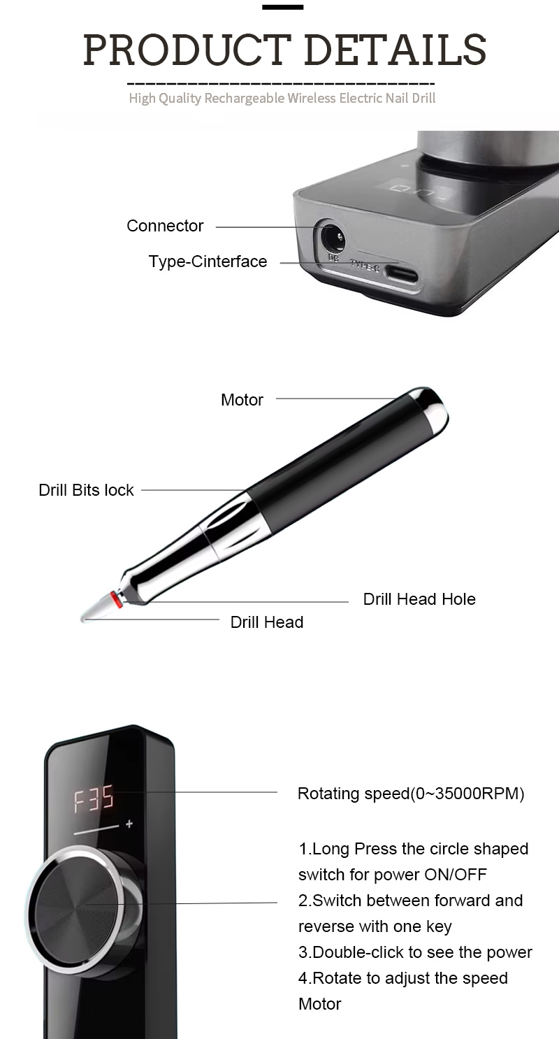Характеристики на продукта и приложения на високоскоростния 35 000 оборота в минута на ноктите с висока скорост 35 000 оборота в минута за премахване на полски