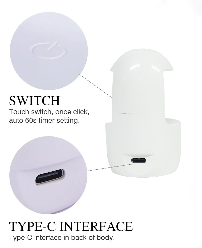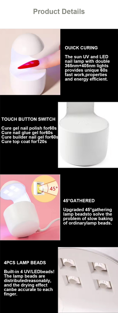 Мини лампа за нокти с един пръст осигурява равномерно изсъхване на лепилото без свиване. Неговите двойни източници на светлина осигуряват нежно нагряване, за да се предотврати обезцветяването на ръцете и напрежението на очите, подходящ както за ръце, така и за крака, осигурявайки забележително бързи резултати от изсушаване.