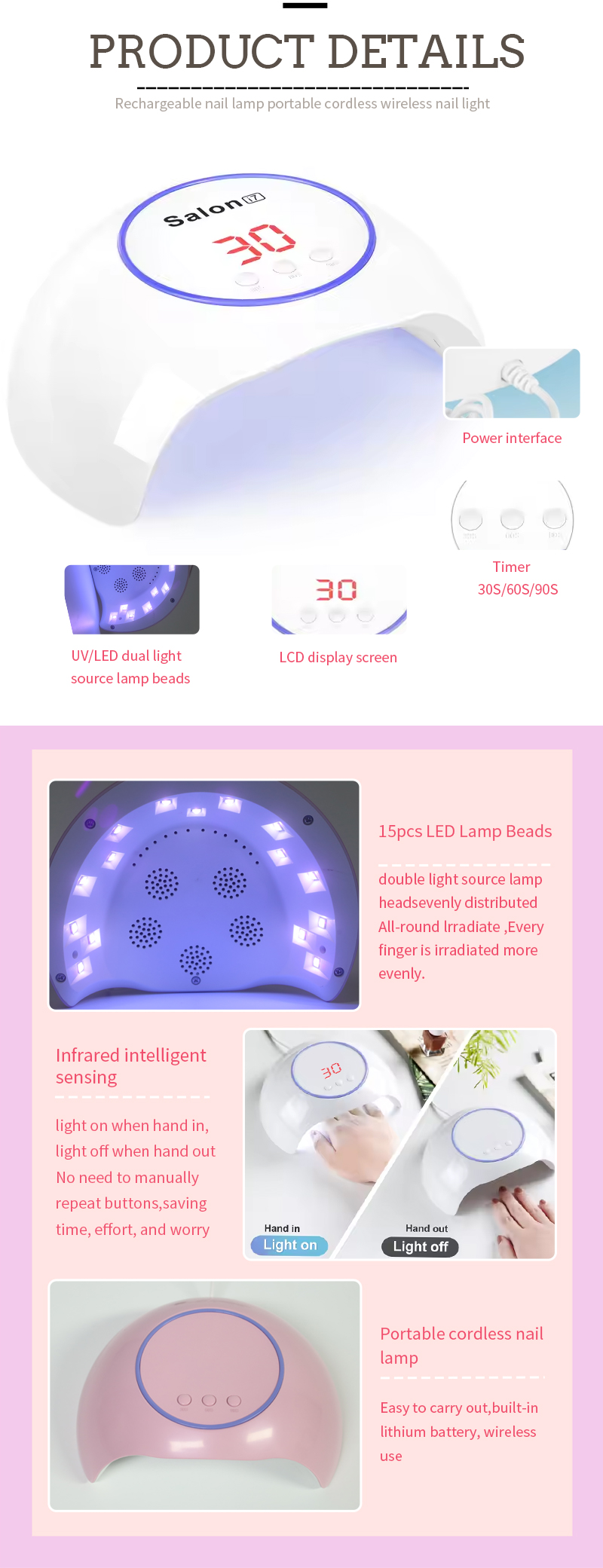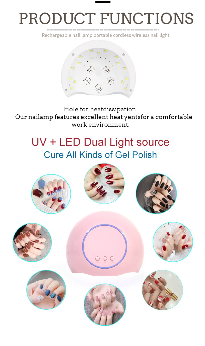 Продуктът гарантира дори сушене на лепило без свиване. Двойните му източници на светлина осигуряват нежно отопление, за да се предотврати обезцветяване на ръцете и напрежение на очите, подходящи за ръцете и краката, което осигурява забележително бързи резултати от изсушаване.