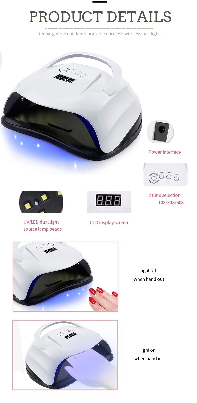 Преносимата лампа за сушене на нокти разполага с инфрачервена технология за интелигентно отчитане, която автоматично светва, когато ръцете се приближат, и се изключва, когато ръцете се отдалечат - елиминира неудобството от многократното натискане на бутони и спестява време и усилия. Лепилото за печене с висока мощност не изисква дълго чакане, спестявайки време и усилия.