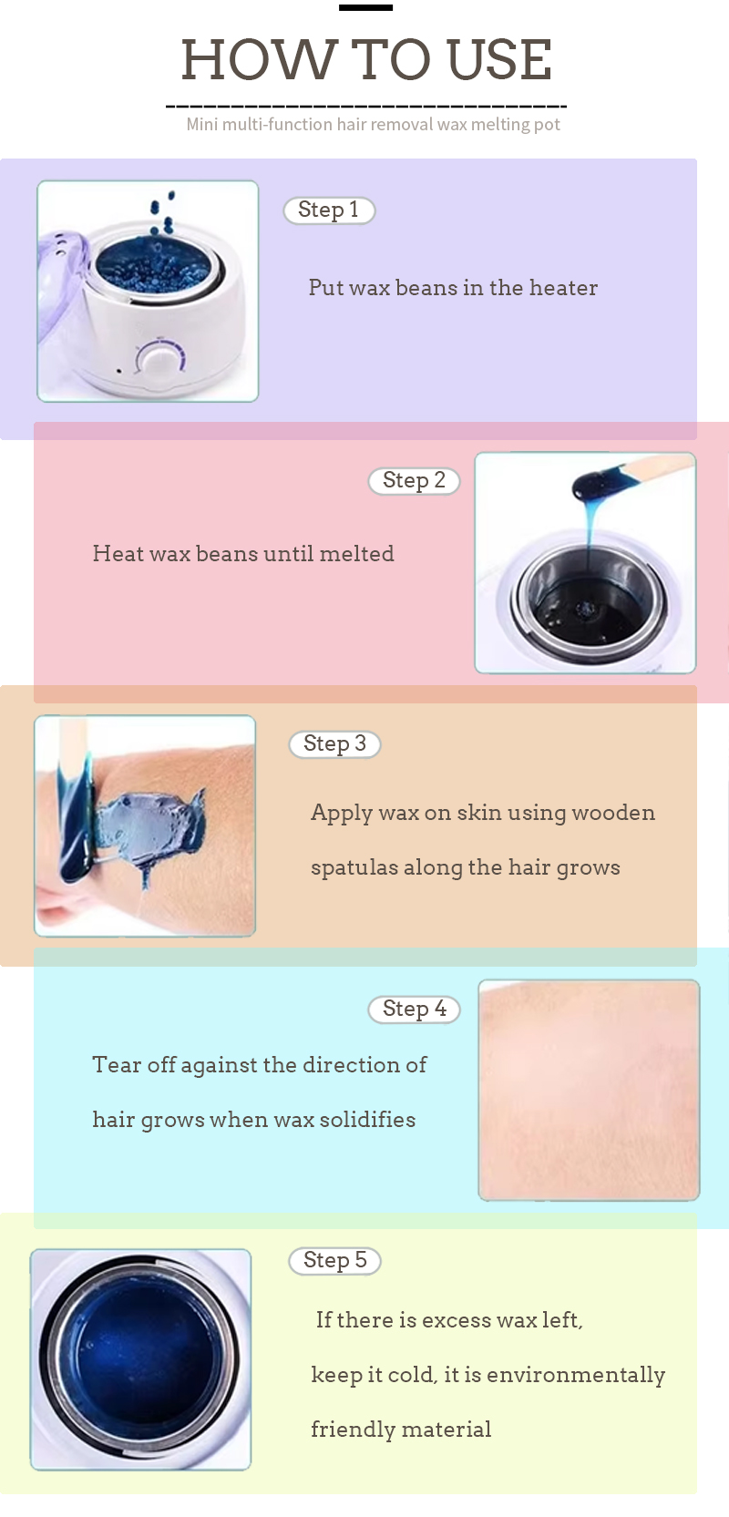 Метод на работа с восък за депилация на продукта, колкото по-висока е температурата, толкова по-бързо се топи восъкът, колкото по-ниска е температурата, толкова по-бавно се топи восъкът, първо се изсипва в подходящото количество восъчни зърна за депилация, нагрява се, докато восъчните зърна се разтопят, след това депилиращи части от равномерно покрития восък за депилация и накрая се откъсват срещу посоката на растеж на косата.