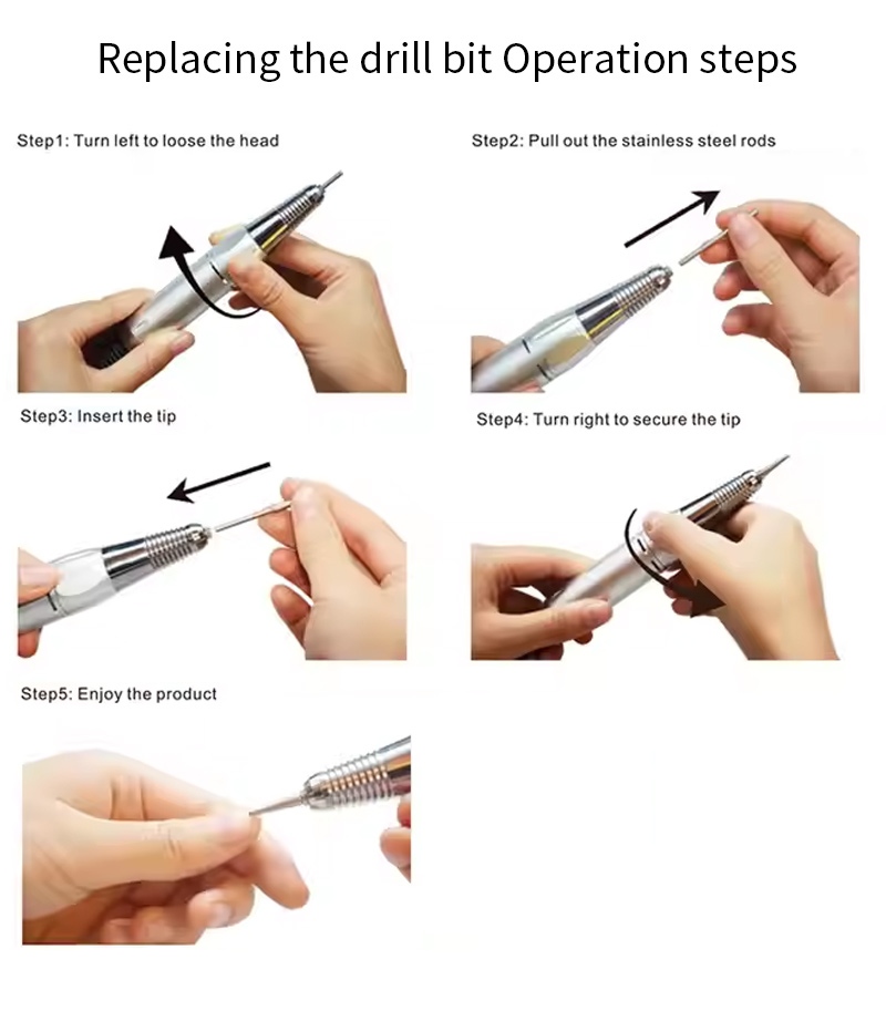 Тази професионална преносима машина за бормашина за нокти 35 000 оборота в минута метод на работа на резервна бормашина, тоест включете и извадете, лесно и удобно, подмяната може да се използва след завършване.